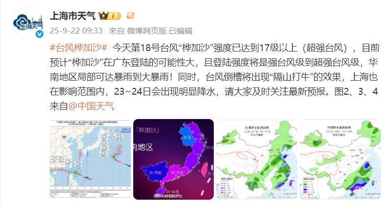 今天第18号台风“桦加沙”强度已达到17级以上(超强台风)目前预计“桦加沙”在广东登陆的可能性大且登陆强度将是强台风级到超强台风级华南地区局部可达暴雨到大暴雨!广州多地紧急通知!本周或停工停课(点击图片查看此前报道) 同时,台风倒槽将出现“隔山打牛”的效果上海也在影响范围内23~24日会出现明显降水