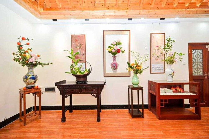 国庆期间,“迎全运之粤港澳花艺展”在广州兰圃公园茅舍非遗艺术馆举行,展出三十余幅传统插花作品。