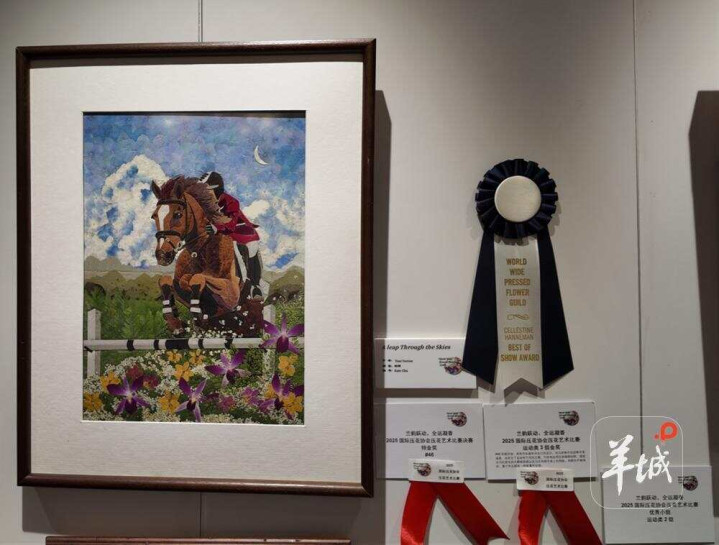展览共展出90幅题材丰富、技法多元的压花作品。其中,《星空下的兰花》以兰花、睡莲与玫瑰再现梵高笔下的绚烂夜空;墨西哥作品《Inspiredbyvictory》运用紫色兰花勾勒出充满张力的运动意象;《团结向上·活力大湾区》则巧妙融入“激情全运会,活力大湾区”主题,展现自然界的竞技之美与生命活力。