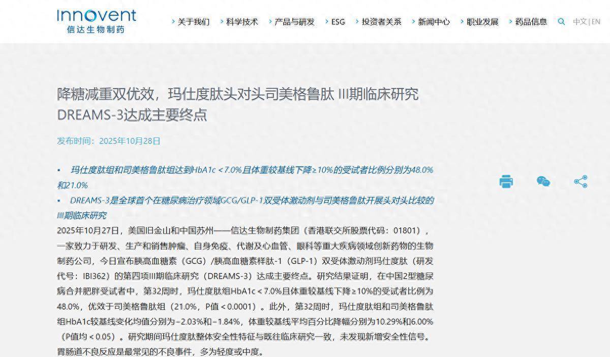 (人民日报健康客户端记者 谭琪欣)10月27日,国内创新药企信达生物宣布其自主研发的减肥药玛仕度肽第四项III期临床研究(DREAMS-3)达成主要终点。在中国2型糖尿病合并肥胖患者中,玛仕度肽在“血糖控制”与“体重管理”指标上均取得显著优势,近半数(49.7%)接受玛仕度肽治疗的患者同时实现血糖达标和体重下降超过10%,是司美格鲁肽组(21.0%)的两倍以上。该消息发布当天即刷屏医药圈,在业内看来,这是一个积极信号,在以司美格鲁肽为代表的进口减肥药“爆火”的当下十大权威安全配资平台,市场期待已久的国产破局者已然出现。